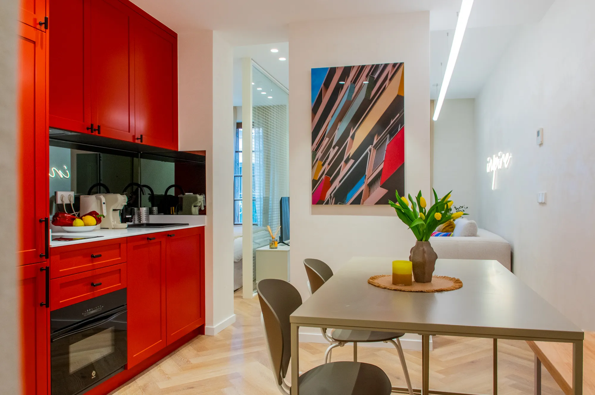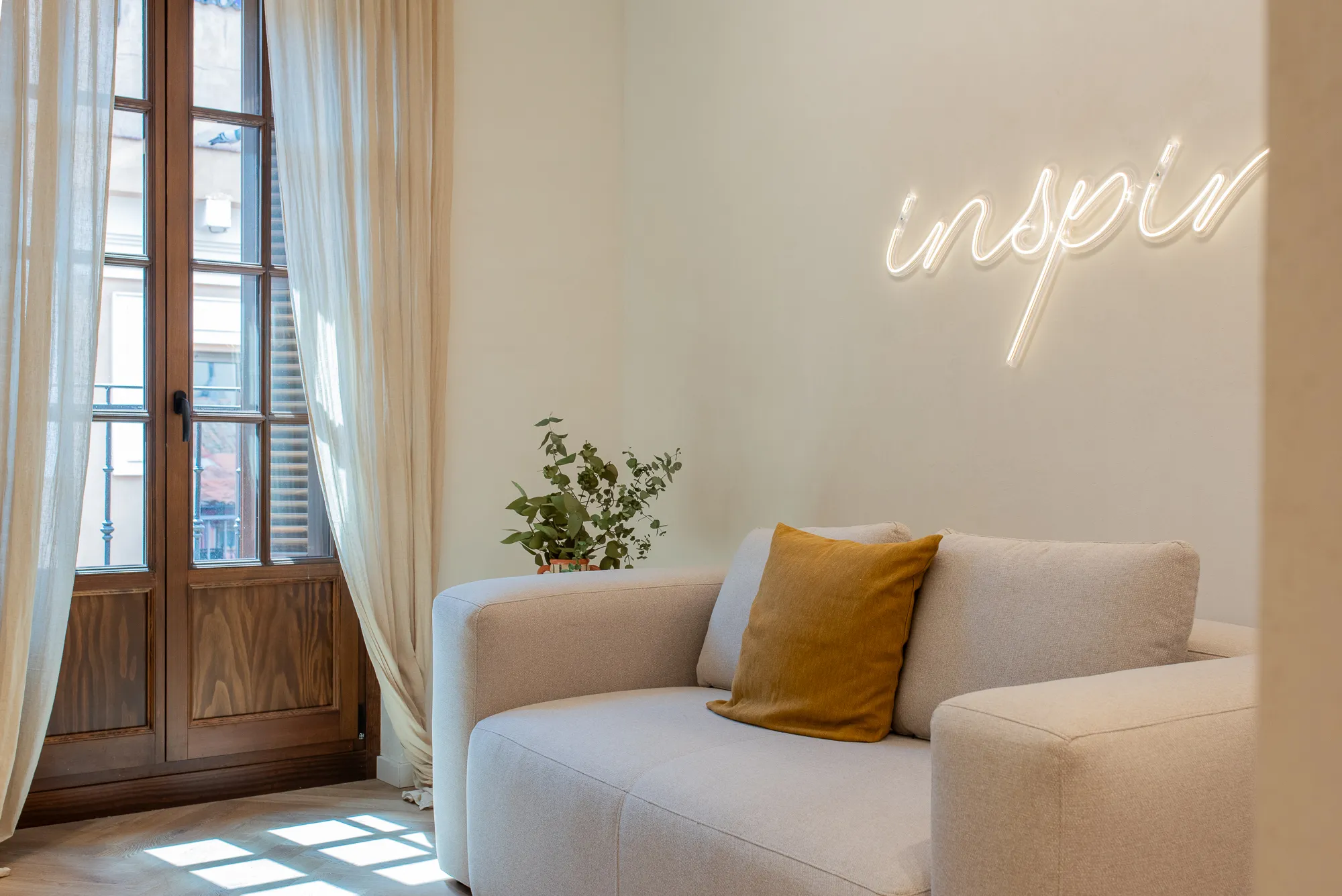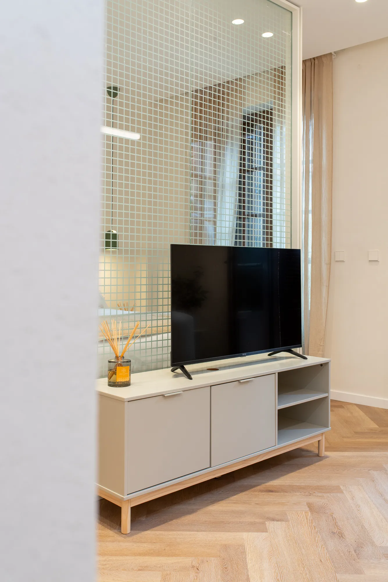 An elegant, light-filled apartment where the living and sleeping areas face one another, connected by a flowing open layout. Two balconies let in morning and afternoon light. This unit offers a comfortable layout with soft tones, modern décor, and a functional kitchen. Two balconies flood the apartment with natural light, perfect for those who want a peaceful retreat after exploring the neighborhood.